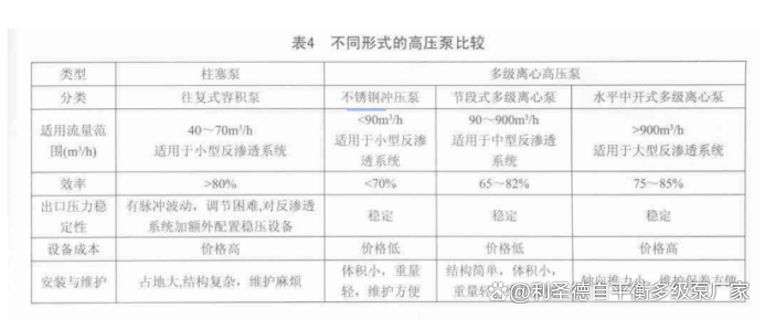 目前,反渗透海水淡化处理系统中常用的高压泵主要有柱塞泵和多级离心高压泵两种,这些产品在国内均已实现技术成熟且系列化生产。以下是不同高压泵的参数范围和效率对比表格。